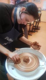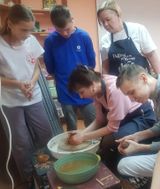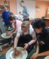 Соха Сабина Станиславовна объяснила последовательность работы и правила разминания глины, отметила, что перед тем, как глину поместить на круг, необходимо ее отбить для лучшего сцепления с поверхностью круга и сфокусировать в центре, то есть правильно выполнить центровку. Немаловажно смачивать руки водой, чтобы они скользили и сглаживали поверхность глины.