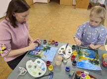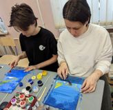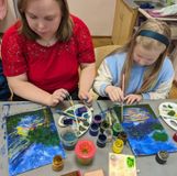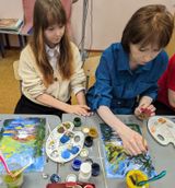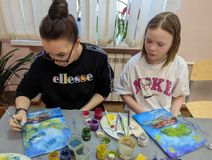 24 февраля 2024 года, в рамках работы клуба «Семейные встречи» состоялся мастер-класс «Морской пейзаж». Участниками мастер-класса стали обучающиеся 1 класса и их родители. Совместное творчество - это отличная идея для новых эмоций и впечатлений! Участники вместе с преподавателем решили перенестись в теплое солнечное лето, на морское побережье, ведь все уже давно мечтают о теплых деньках! Преподаватель Охримович Екатерина Владимировна предложила выполнить пейзаж в нетрадиционных техниках рисования без использования кисточек. Весь процесс работы участники наблюдали по трансляции через документ-камеру. Фон выполняли в технике заливка гуашью с помощью губки. Использовали цвета синих оттенков, розоватых, фиолетовых, старясь на небе изобразить фактуру облаков, заката. Зубными щетками прорисовали облака. Стеки помогали в изображении полукруга солнца, прорисовки облаков и отражения, бликов на море. Фактурность растений на берегу выполняли шариками из фольги, стараясь углубить тени. Разнообразить мазок помогла коктейльная трубочка, она отлично подходит для создания объема. Участники, проявив свою креативность и талант, очень красиво изобразили пальмы, экзотические цветы и море в закате. Родители, в процессе работы, с интересом наблюдали за своими детьми, помогали им, поддерживали, давали советы и сами с удовольствием участвовали в процессе рисования, познавая нетрадиционные техники. Здорово, что творчество объединило и сблизило детей и их родителей. Совместное творчество формирует хорошие доверительные отношения, оказывает положительное влияние на развитие ребенка и приучает его сотрудничать. Результат – довольные и счастливые дети и родители! За окном снег, а на наших работах знойный южный закат и манящее море! До скорых, душевных встреч в «Семейном клубе»!
