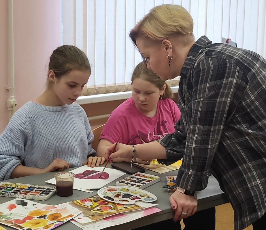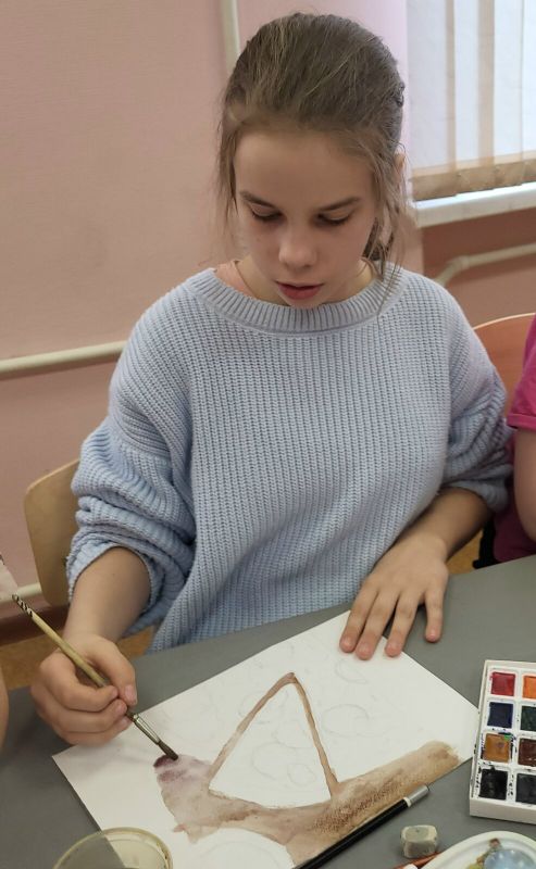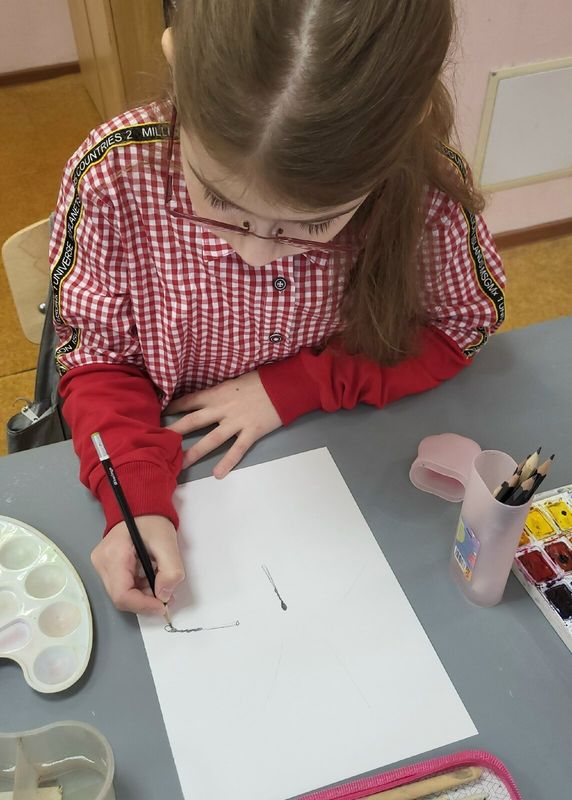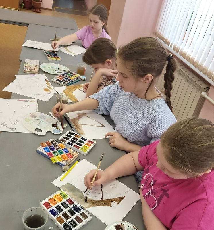 , с предварительным наброском в карандаше. Обучающиеся наблюдали весь процесс через документ – камеру. Делали заливки акварелью, создавали контрастность, знакомились с правилами, приёмами скетчинга. Сюжет был для всех одинаковый, но скетчи получились разные.