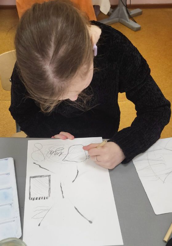 Для начала преподаватель предложила обучающимся выполнить упражнения "Спички", "Придумай образ из линий". Эти упражнения предназначены для развития фантазии, воображения, умения быстро создавать небольшие зарисовки. Работали простыми карандашами, выполняя штриховку с акцентами. Далее выполнили скетч «Пицца»